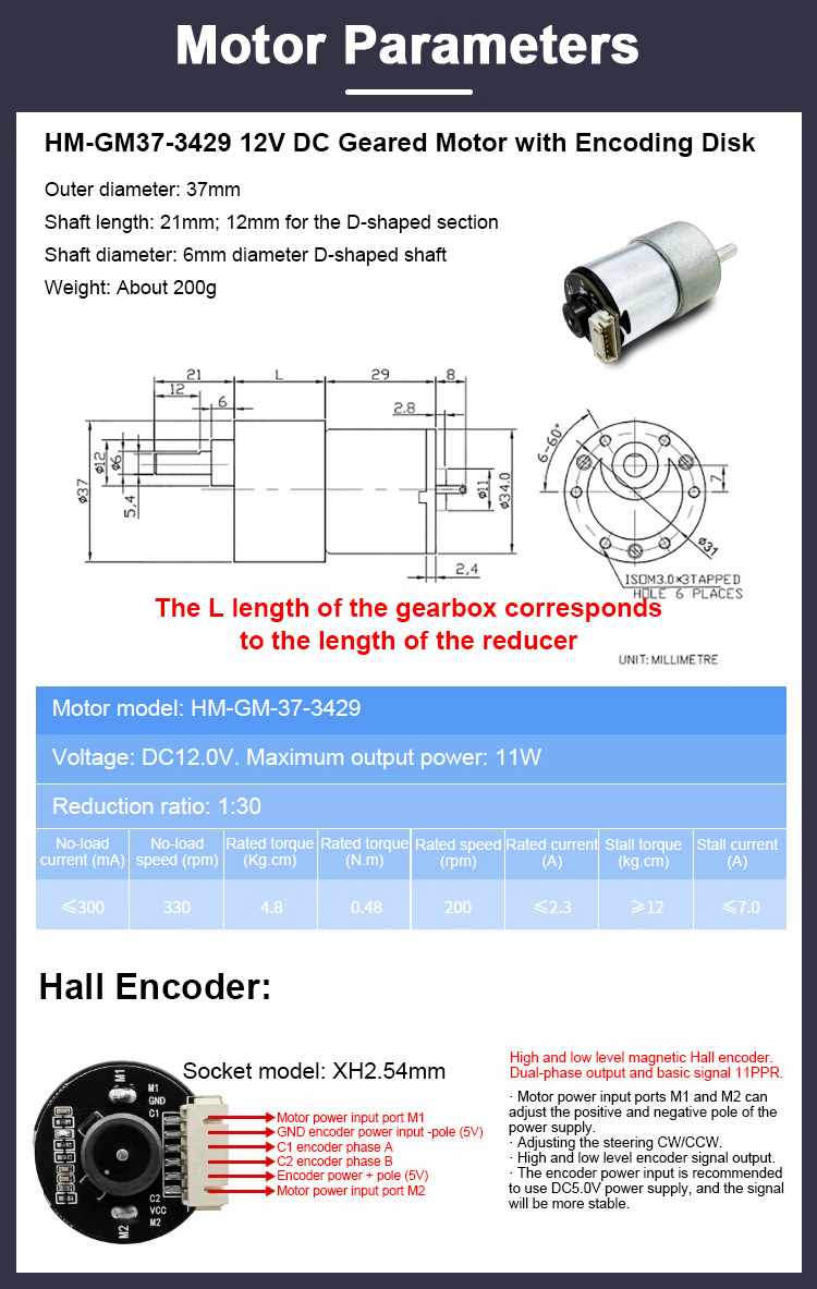 - The default reduction ratio of 37 motor with encoding disk is 1:30. If you need other reduction ratios, please contact customer service;