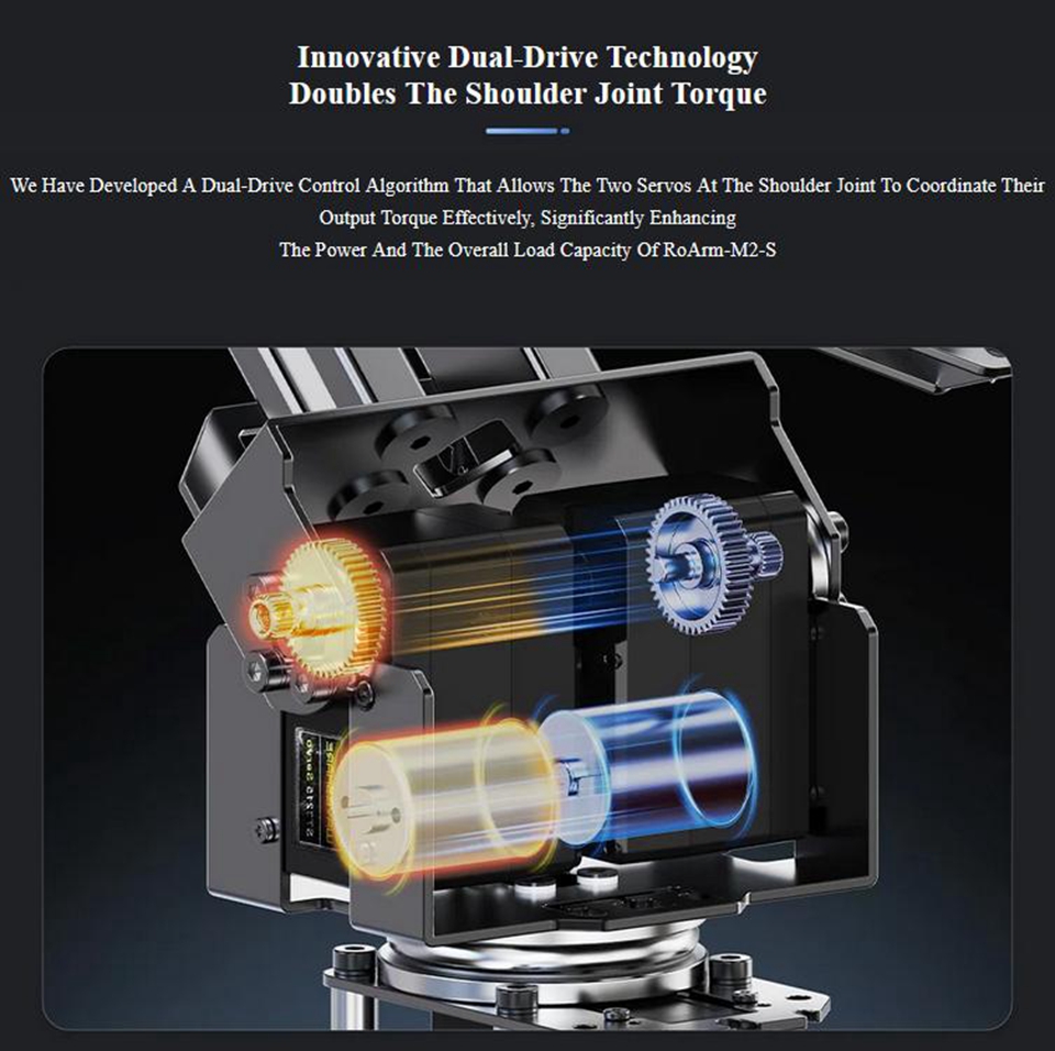 - We have developed a dual-drive control algorithm that allows the two servos at the shoulder joint to coordinate their output torque effectively, significantly enhancing the power and the overall load capacity of RoArm-M2-S.
