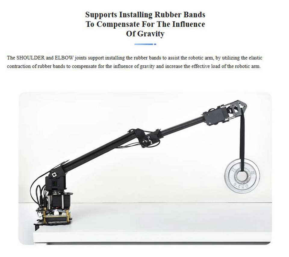 - The SHOULDER and ELBOW joints support installing the rubber bands to assist the robotic arm, by utilizing the elastic contraction of rubber bands to compensate for the influence of gravity and increase the effective load of the robotic arm.