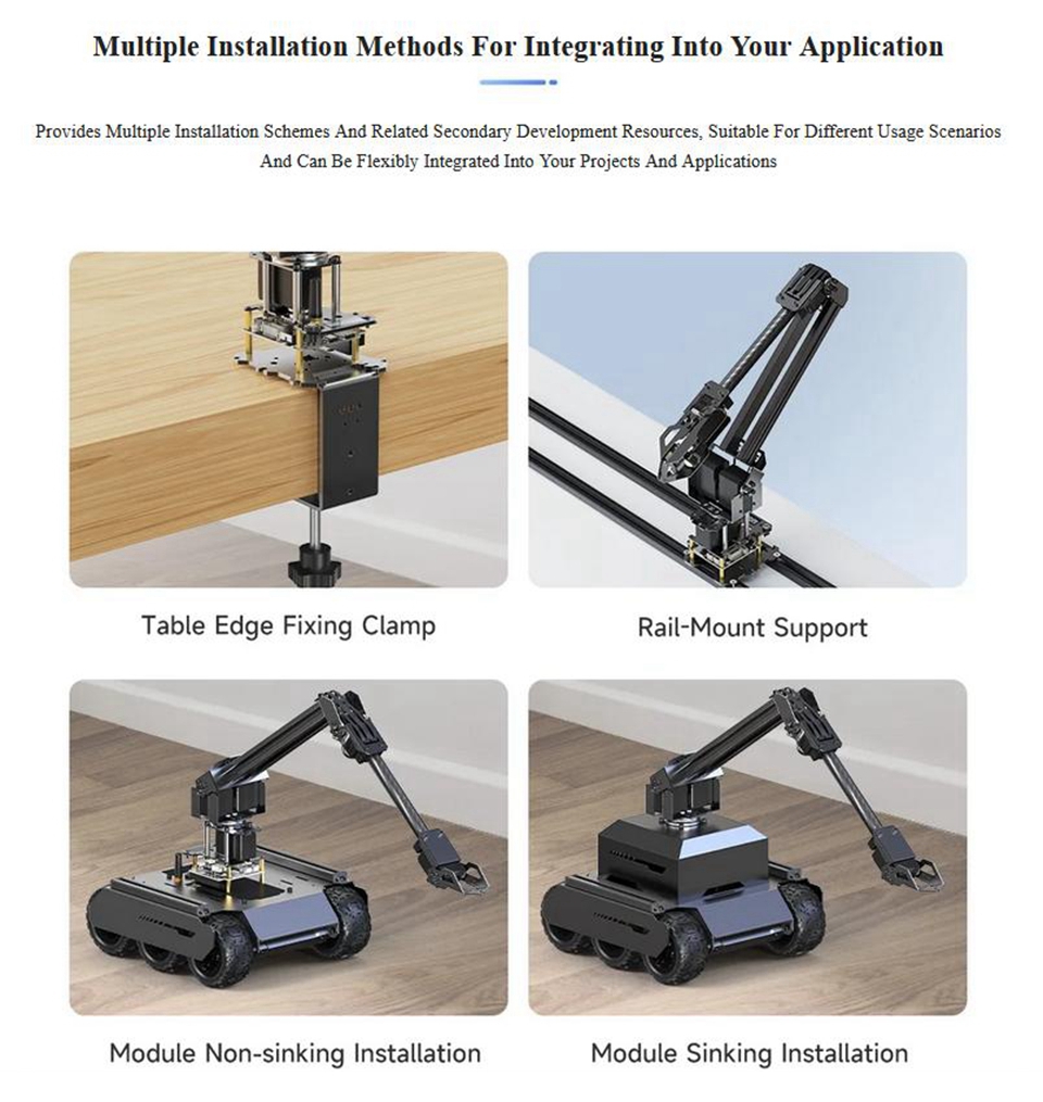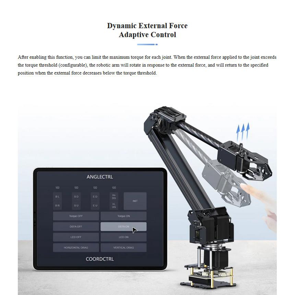 - Provides a user-friendly and cross-platform WEB application that integrates a simple and visualized coordinate control mode, making it easier to get started. Comes with rich graphic and video tutorials to help you learn and use it quickly. Compatible with ROS2 and various host computers, supports various wireless and wired communication modes. Comes with an expansion plate, supports customizing the EoAT (End of Arm Tooling) to meet innovative application requirements.