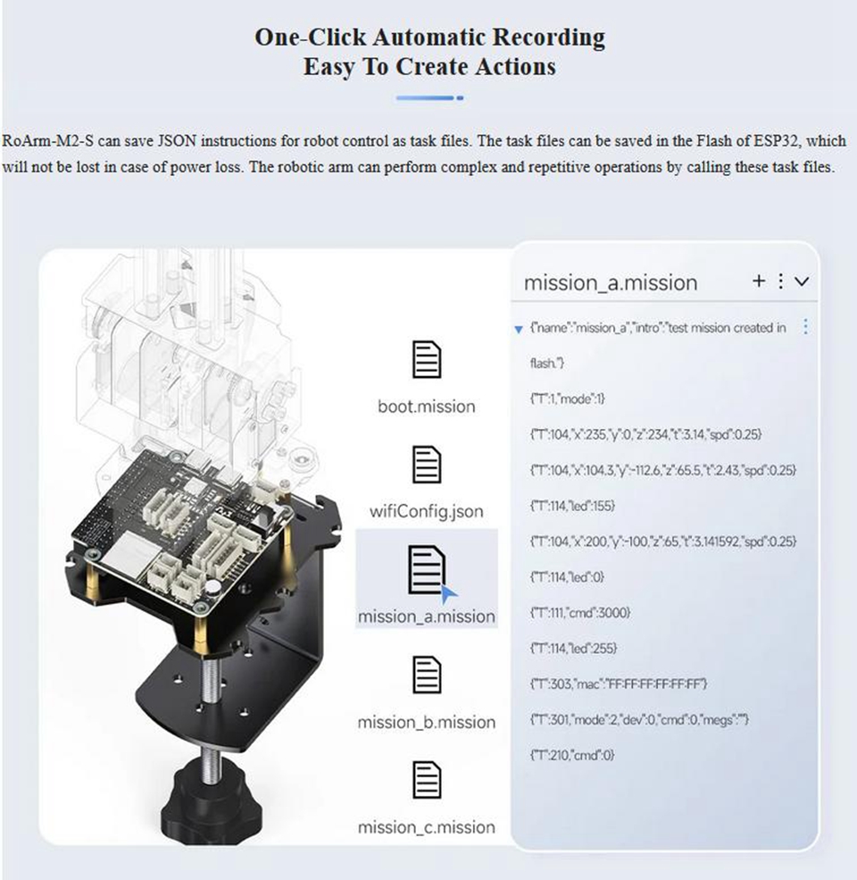- RoArm-M2-S can save JSON instructions for robot control as task files. The task files can be saved in the Flash of ESP32, which will not be lost in case of power loss. The robotic arm can perform complex and repetitive operations by calling these task files.