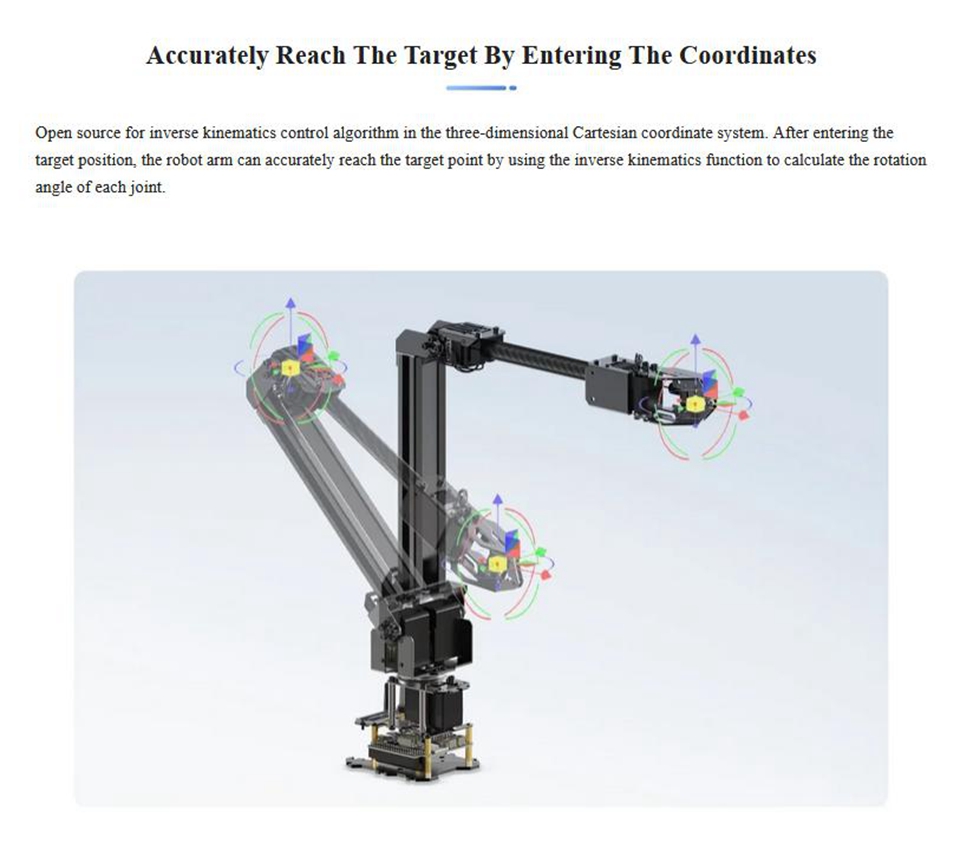 - Open source for inverse kinematics control algorithm in the three-dimensional Cartesian coordinate system. After entering the target position, the robot arm can accurately reach the target point by using the inverse kinematics function to calculate the rotation angle of each joint.