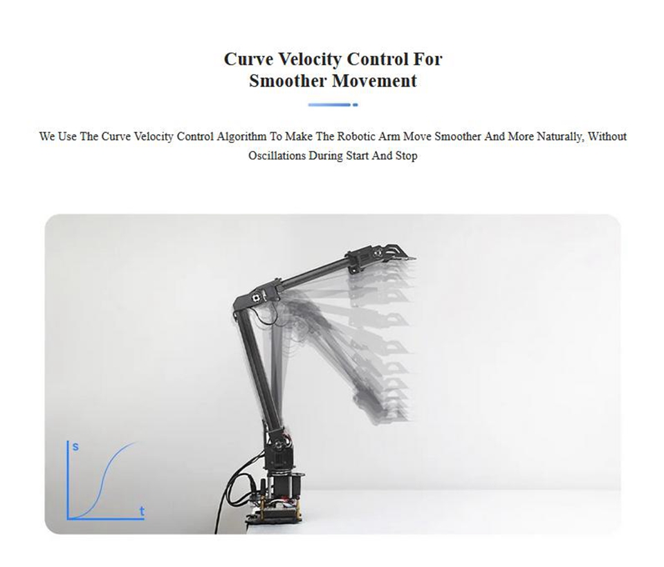 - We use the curve velocity control algorithm to make the robotic arm move smoother and more naturally, without oscillations during start and stop.