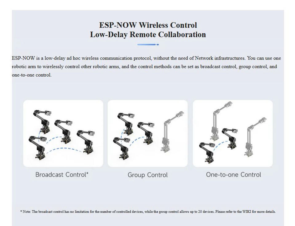 - ESP-NOW is a low-delay ad hoc wireless communication protocol, without the need of Network infrastructures. You can use one robotic arm to wirelessly control other robotic arms, and the control methods can be set as broadcast control, group control, and one-to-one control.