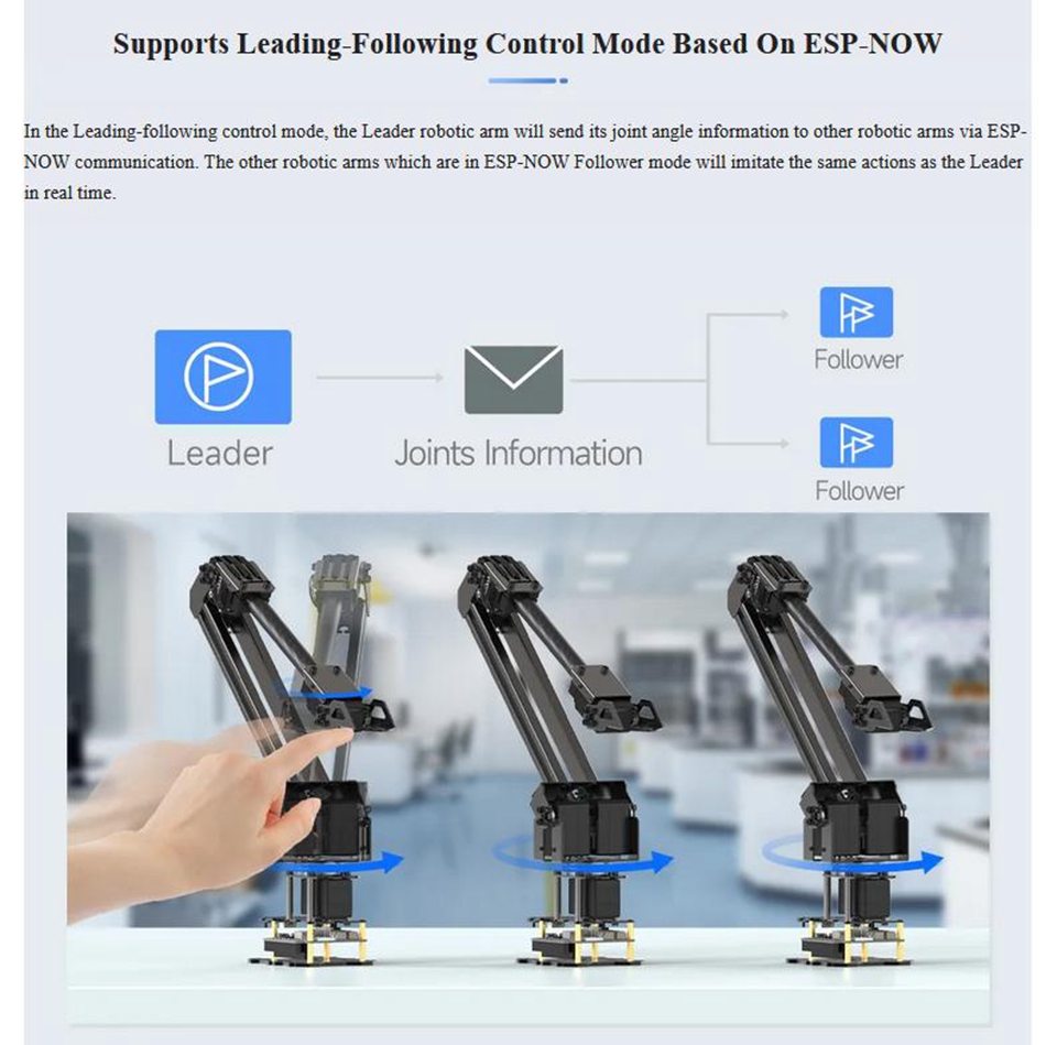 - In the Leading-following control mode, the Leader robotic arm will send its joint angle information to other robotic arms via ESP-NOW communication. The other robotic arms which are in ESP-NOW Follower mode will imitate the same actions as the Leader in real time.