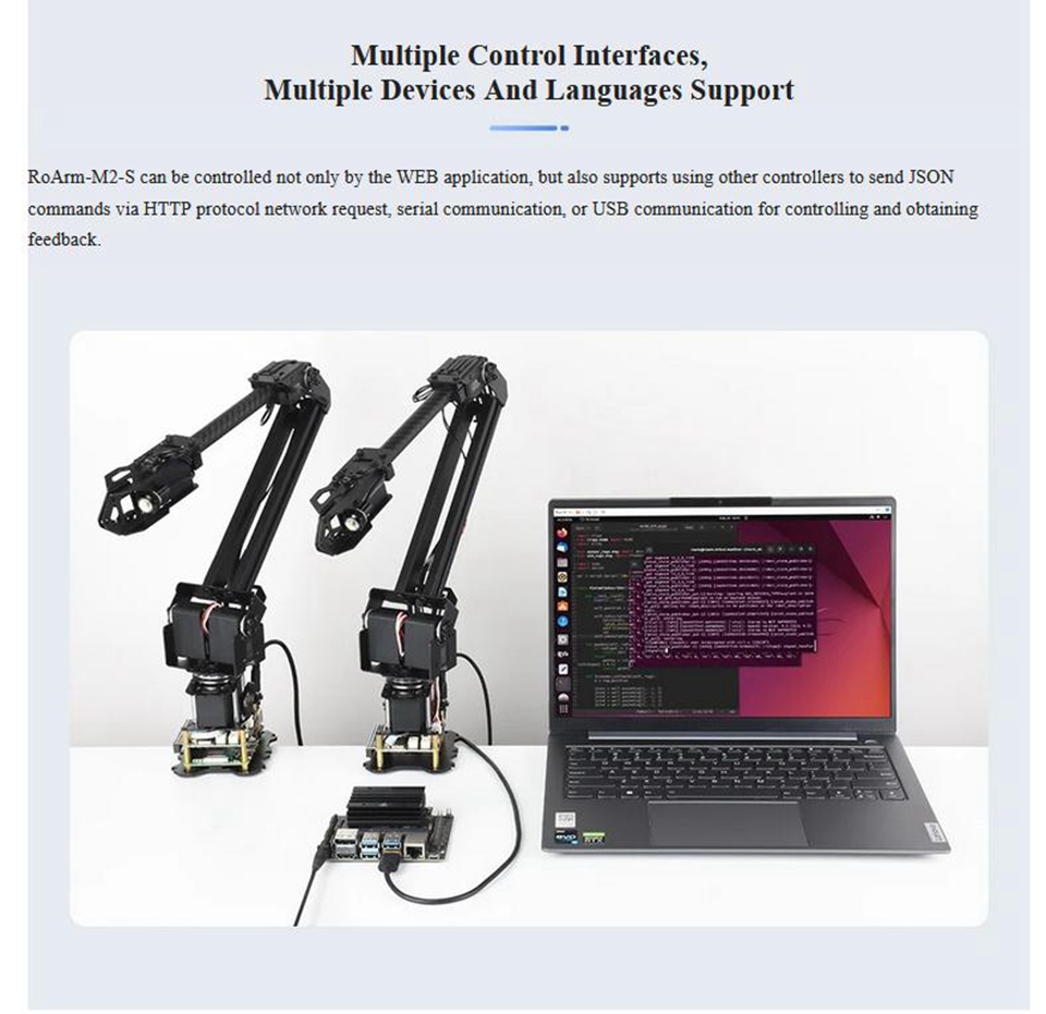 - RoArm-M2-S can be controlled not only by the WEB application, but also supports using other controllers to send JSON commands via HTTP protocol network request, serial communication, or USB communication for controlling and obtaining feedback.