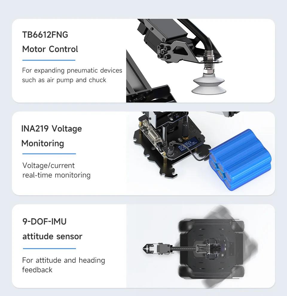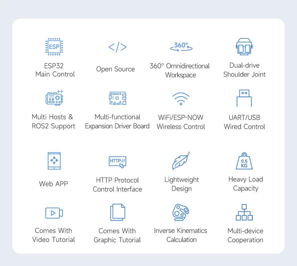 - The joint direct-drive design enhances repositioning precision and also improves structural reliability, with innovative dual-drive technology doubles the shoulder joint torque. Onboard ESP32 MCU main control module supports multiple wireless control modes, provides control interfaces and rich communication protocols for easily connecting to various devices.