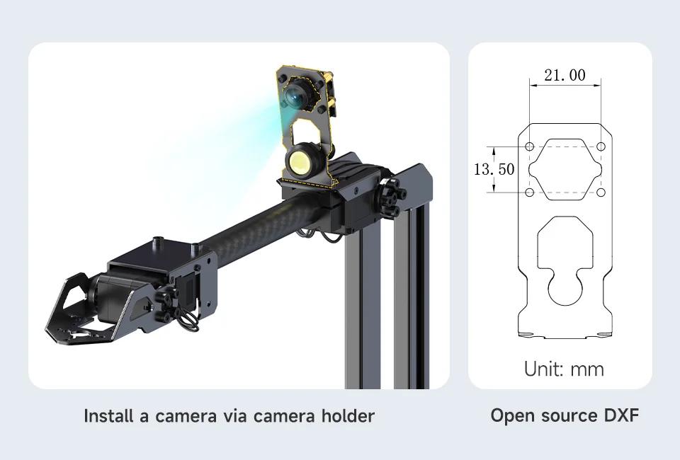 - Comes with a camera holder and open source for the related drawings. You can directly install a camera with the corresponding size or other cameras with an adapter.