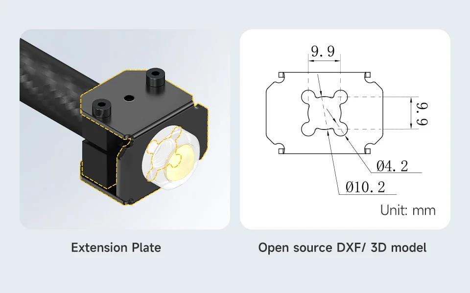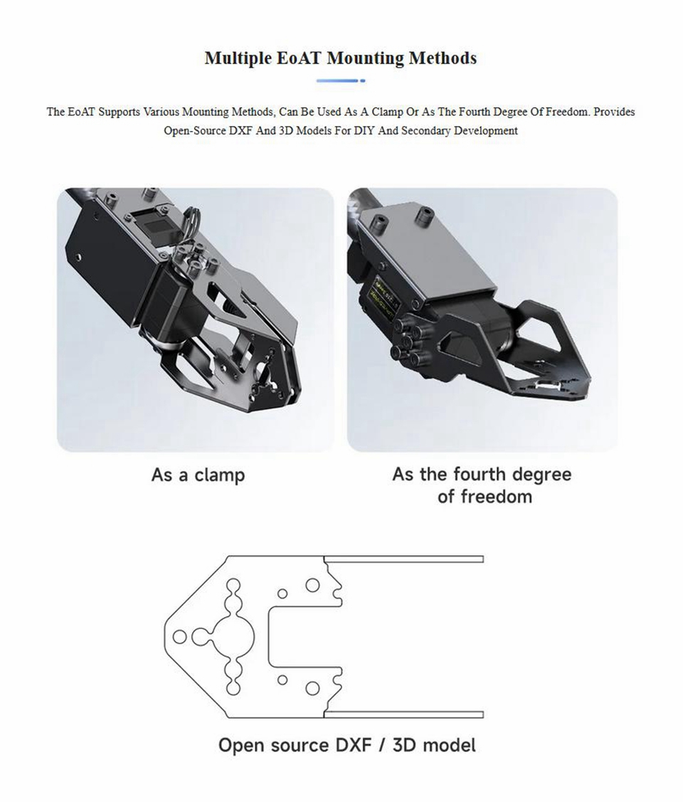 - The EoAT supports various mounting methods, can be used as a clamp or as the fourth degree of freedom. Provides Open-Source DXF and 3D models for DIY and secondary development.