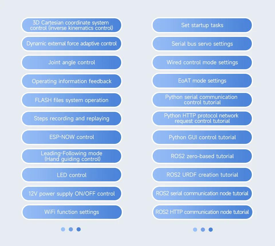 - Demo: 3D Cartesian coordinate system control (inverse kinematics control); Dynamic external force adaptive control; Joint angle control; Operating information feedback; FLASH files system operation; Steps recording and replaying; ESP-NOW control; Leading-Following mode (Hand guiding control); LED control; 12V power supply ON/OFF control; WiFi function settings; Set startup tasks; Serial bus servo settings; Feedback mode setting; EoAT mode setting, etc. (Note: Please refer to the WIKI for more details)