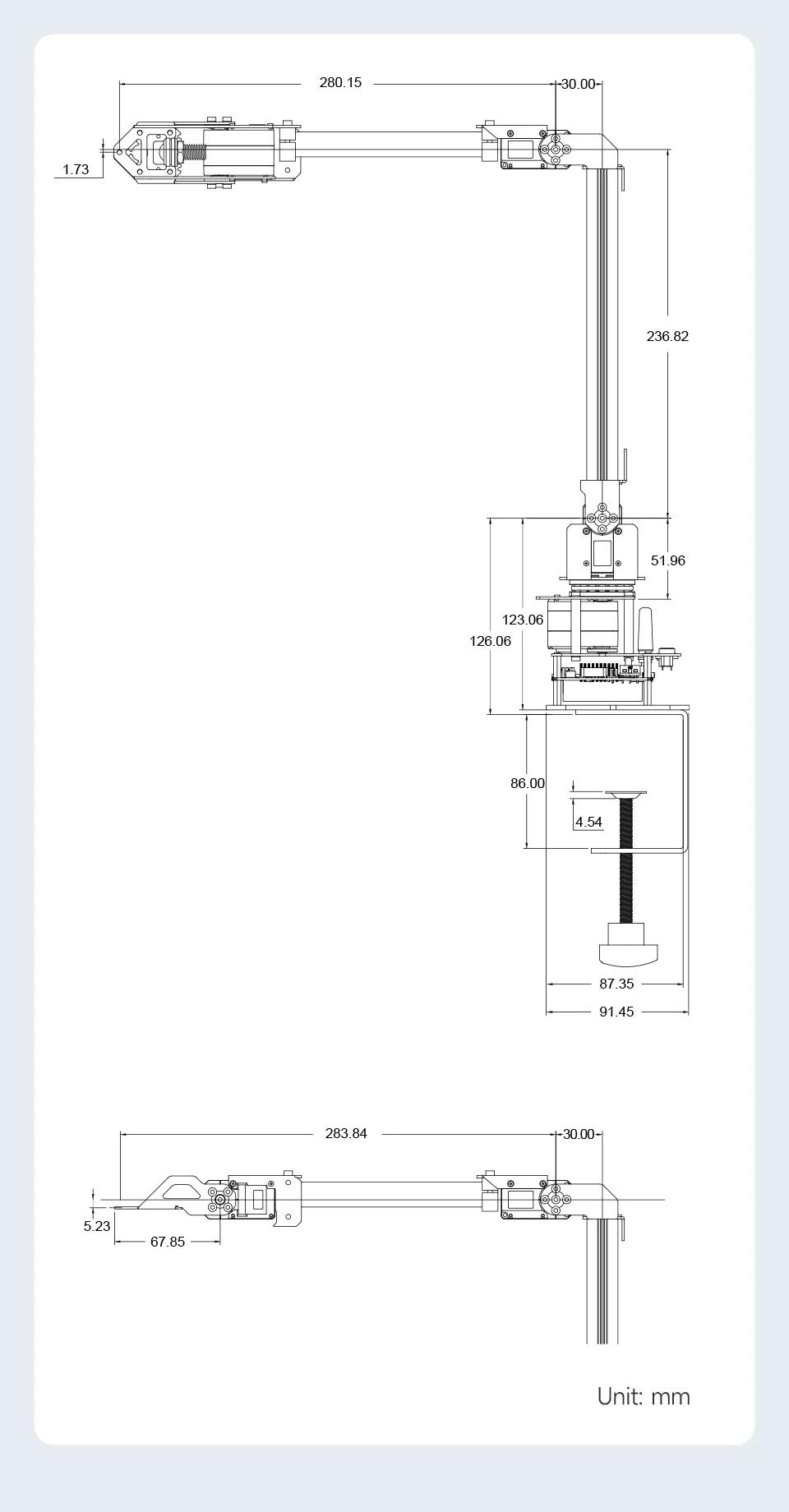 - Robotic arm weight: 826 ±15g (not including the table edge fixing clamp)