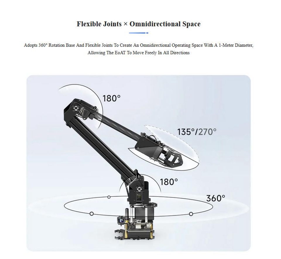 - Adopts 360° rotation base and flexible joints to create an omnidirectional operating space with a 1-Meter diameter, allowing the EoAT to move freely in all directions.