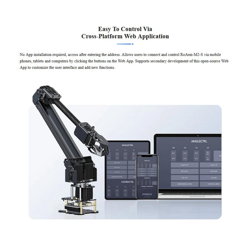 - No App installation required, access after entering the address. Allows users to connect and control RoArm-M2-S via mobile phones, tablets and computers by clicking the buttons on the Web App. Supports secondary development of this open-source Web App to customize the user interface and add new functions.