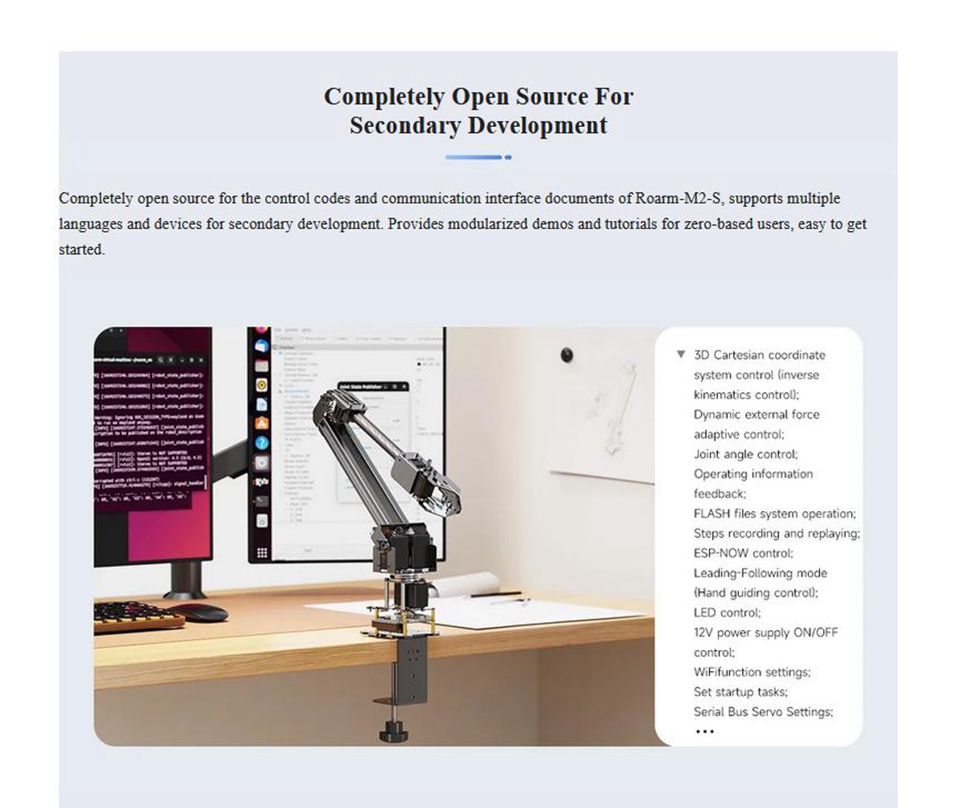 - Completely open source for the control codes and communication interface documents of Roarm-M2-S, supports multiple languages and devices for secondary development. Provides modularized demos and tutorials for zero-based users, easy to get started.