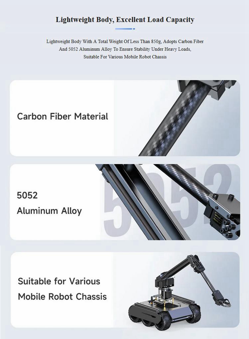 - Lightweight body with a total weight of less than 850g, adopts carbon fiber and 5052 aluminum alloy to ensure stability under heavy loads, suitable for various mobile robot chassis.