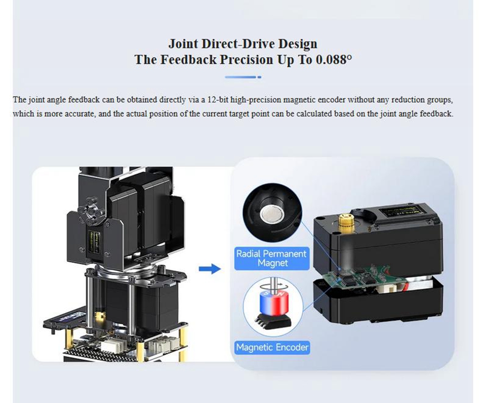 - The joint angle feedback can be obtained directly via a 12-bit high-precision magnetic encoder without any reduction groups, which is more accurate, and the actual position of the current target point can be calculated based on the joint angle feedback.