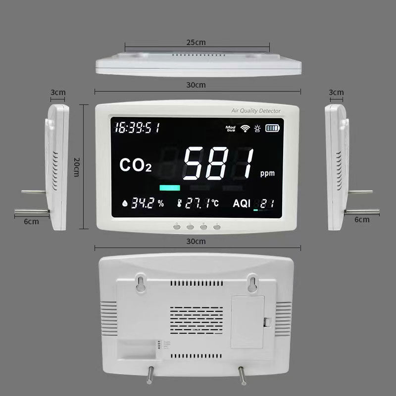 - This product uses NDIR (Non-dispersive Infrared Ray) gas sensors to accurately detect the concentration of carbon dioxide in the surrounding air, as well as temperature, and humidity, and calculate the environmental AQI index based on the detection data.