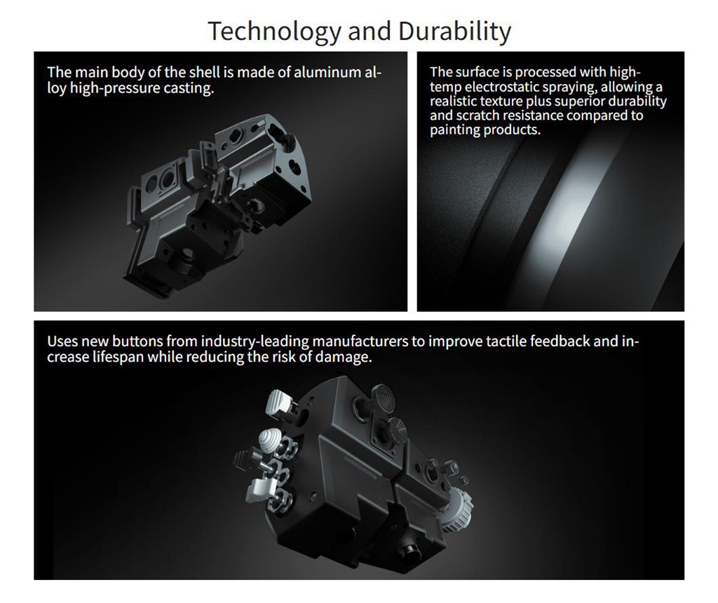 - Heavy-Pressed Aluminum Alloy with CNC for exterior. Inject Plastic Mold for Extension kit.