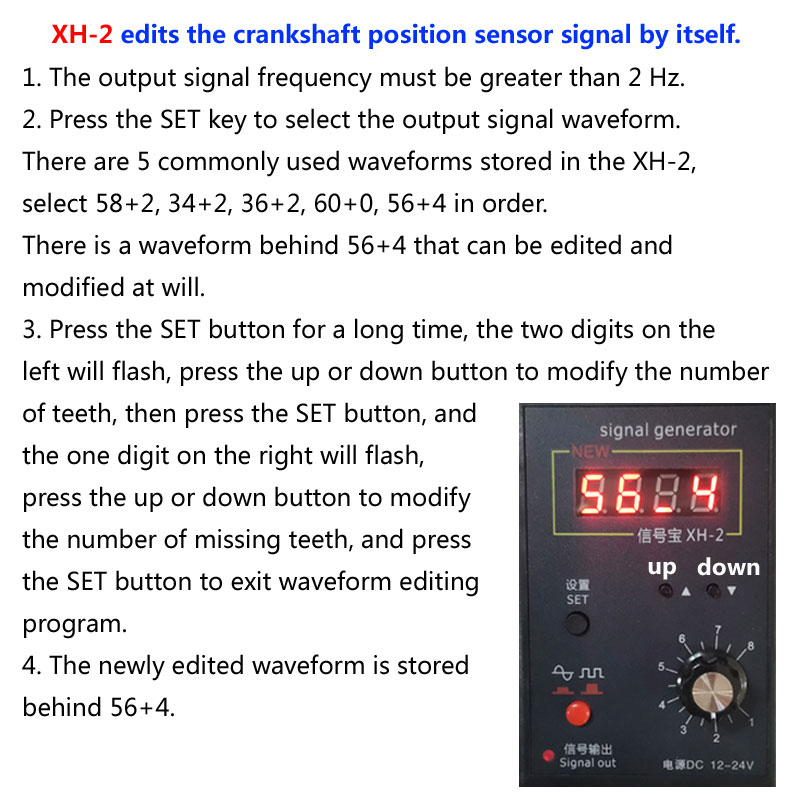 - When the signal generator output is higher than 2HZ, press SET button, it can output 10 types of signal, 60-0 represents standard magnetoelectric or Hall signal output, the other 9 types of signal are magnetoelectric or Hall gear missing teeth signal (crankshaft position sensor signal).