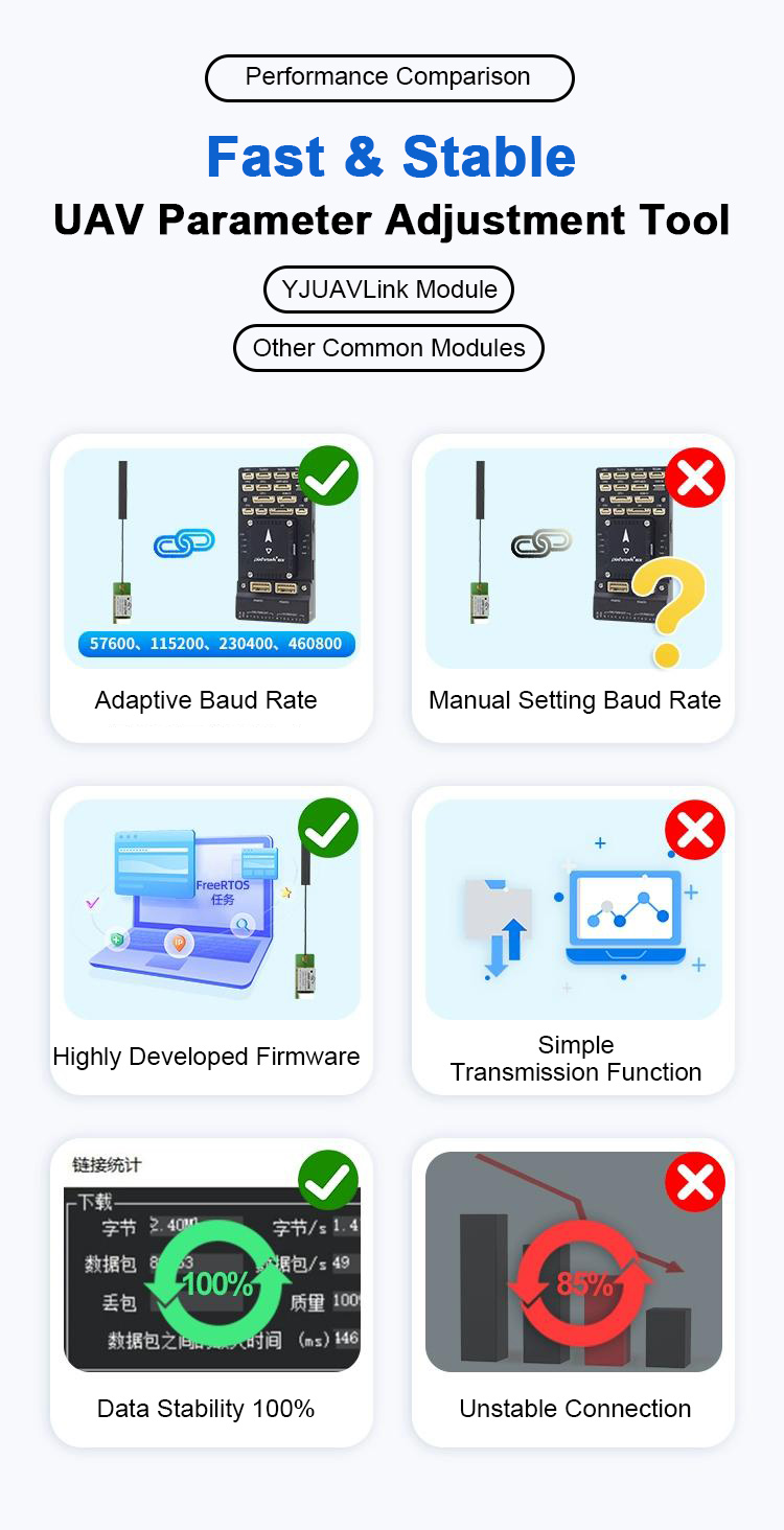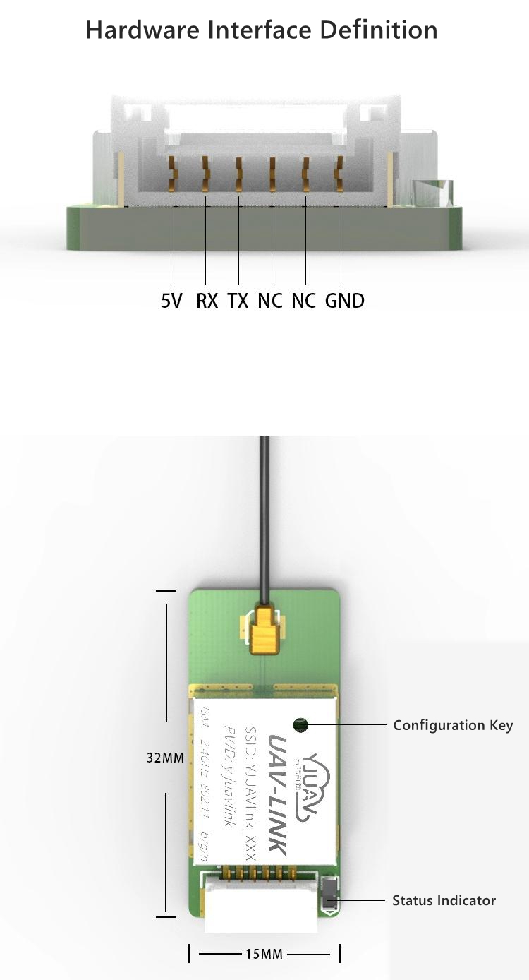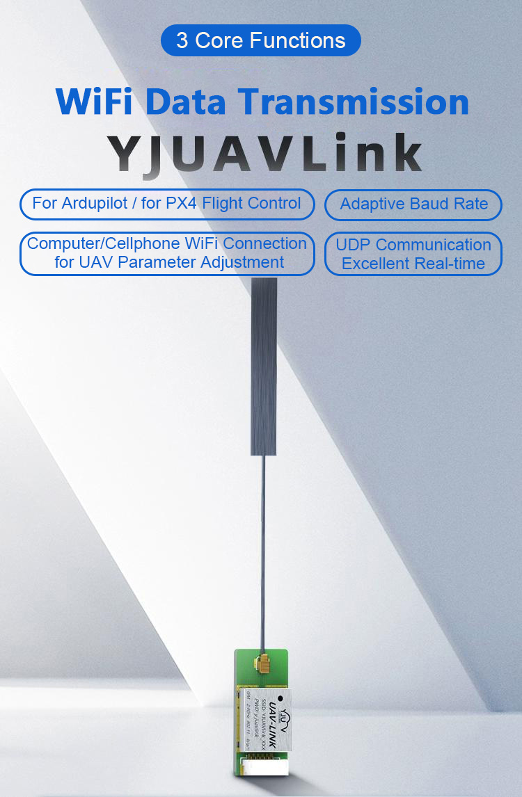 - YJUAVLink is a close range data transmission module with 2.4GHz WiFi frequency band, supporting IEEE 802.11b/g/n, data rate up to 150Mbps.