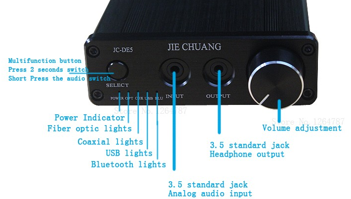 - JC-DE5 integrates optical fiber, coaxial, USB, analog audio signal input. It is decoder and headphone amplifier.