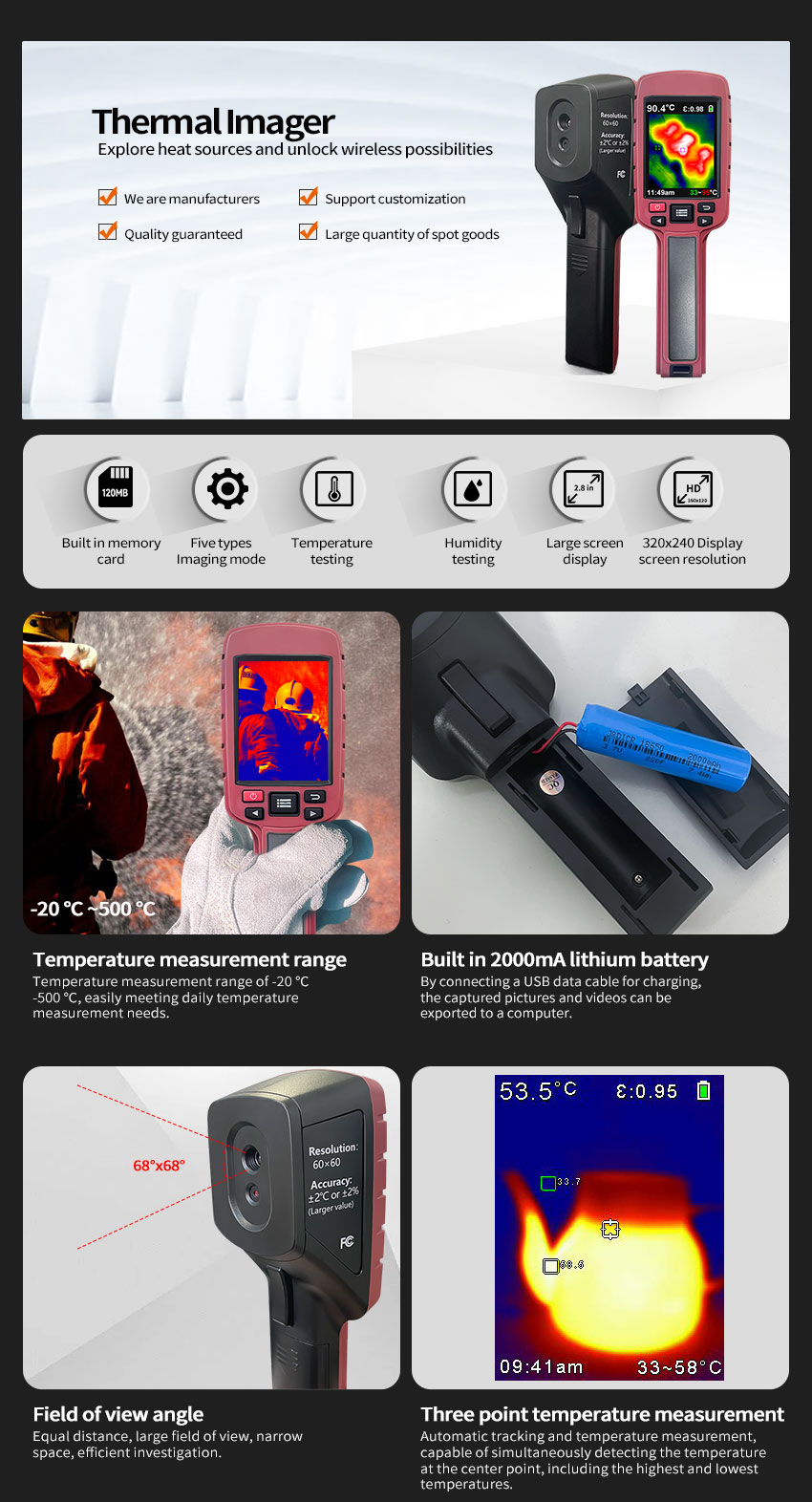 - Emissivity: 0.1~0.99 adjustable