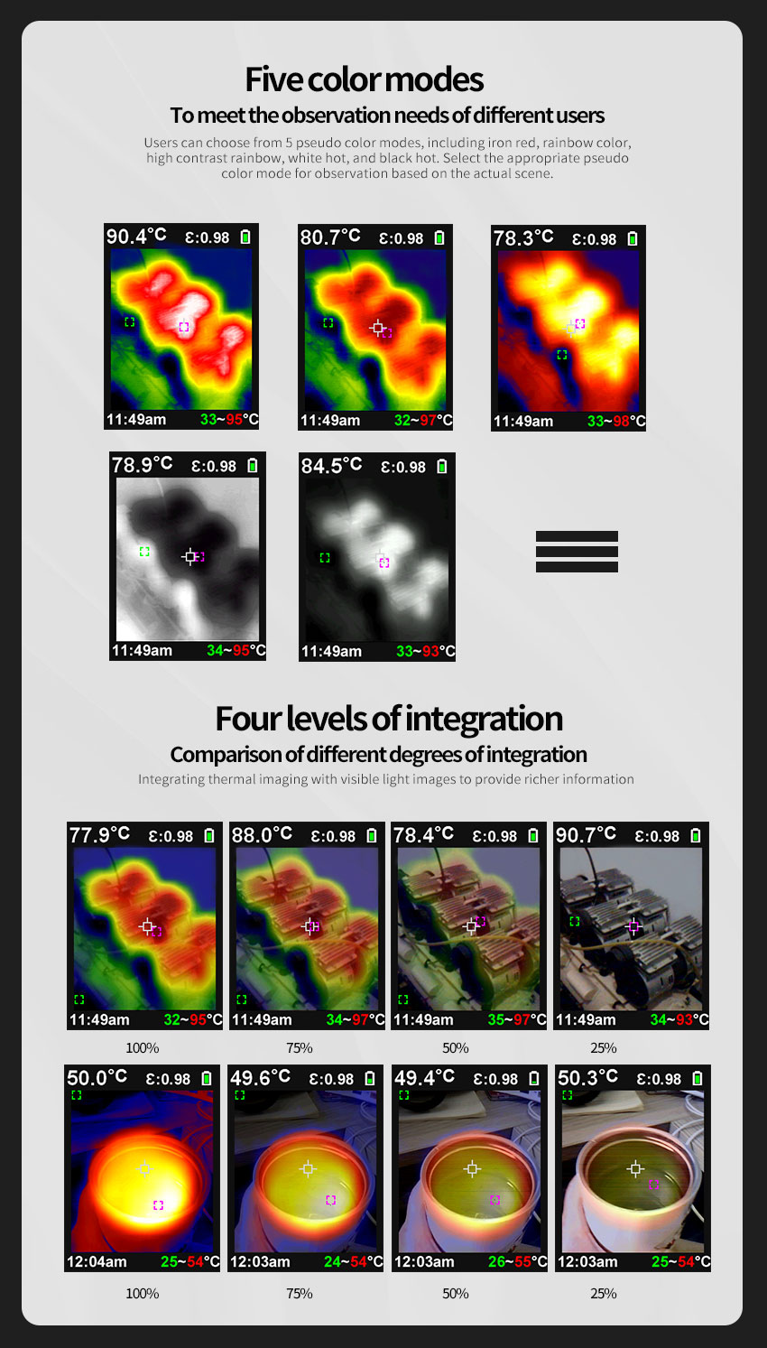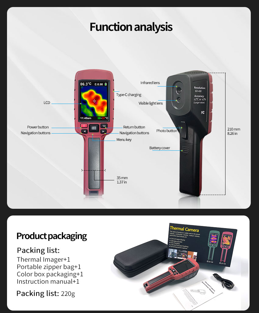 - This device is a tool-based handheld infrared thermal imager, which can realize the combination of surface temperature measurement and real-time thermal image. With 3600 infrared pixels, potential problems can be clearly displayed on the color display, which helps users quickly and accurately locate the center point of the measurement cursor and measure the temperature. In order to increase the degree of recognition, the image can be mixed from a full thermal image to a full visual image.