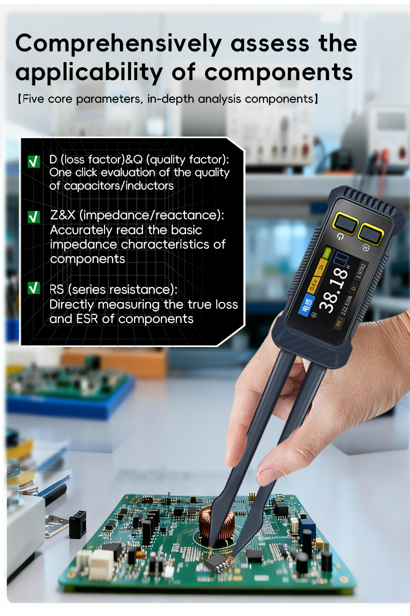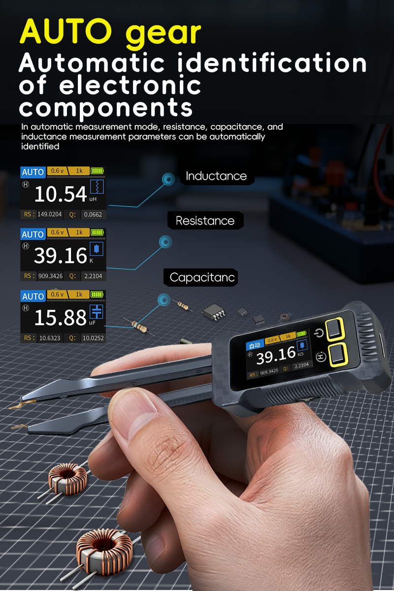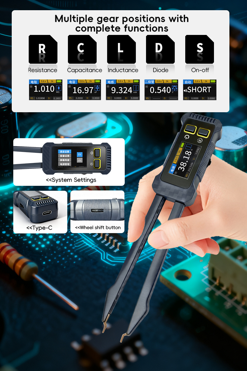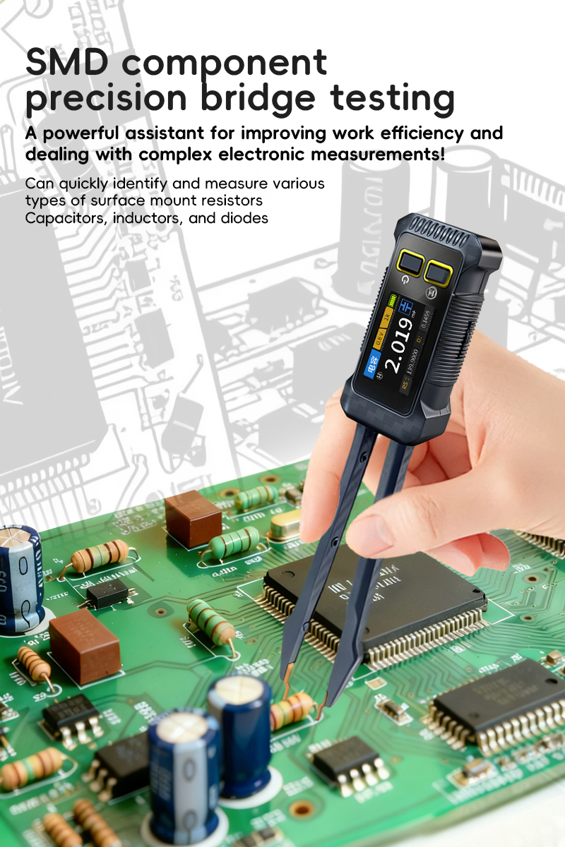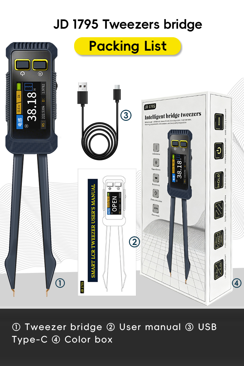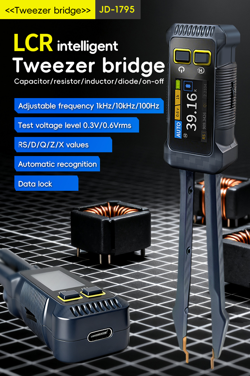 - JD-1795 intelligent LCR bridge tweezers are designed for rapid verification of electronic components, circuit board debugging, and fault diagnosis. By adopting precision automatic balancing bridge technology and optimizing the design of low contact resistance tweezers, the key parameters of resistance (R), inductance(L), capacitance (C) and diode can be accurately and quickly measured directly on the circuit board (without disassembly) or offline, including impedance value (Z), reactance value (X), equivalent series resistance value (Rs), loss factor value (D/Q), and support standard test frequencies of 100Hz, 1kHz, 10kHz as well as adjustable 0.3v and 0.6v levels.Integrated 1.14-inch high-resolution color display screen, presenting real-time and intuitive measurement functions and parameter information. The unique structure of the tweezers conforms to ergonomic design, enabling stable contact and comfortable operation even in small spaces. It is an intelligent and portable tool for engineers to improve work efficiency and ensure measurement accuracy.