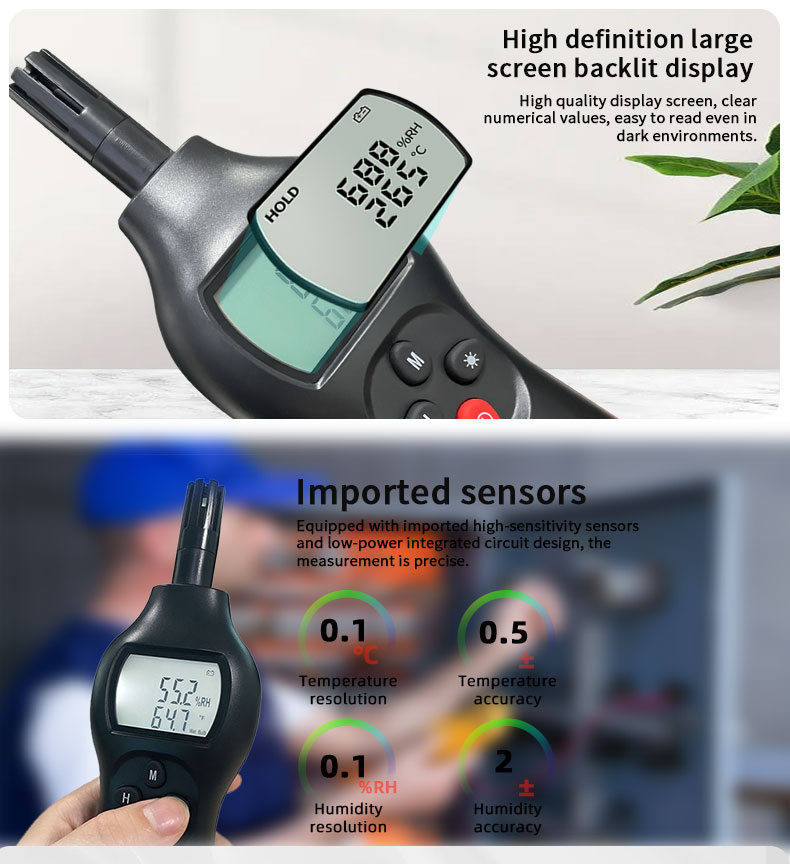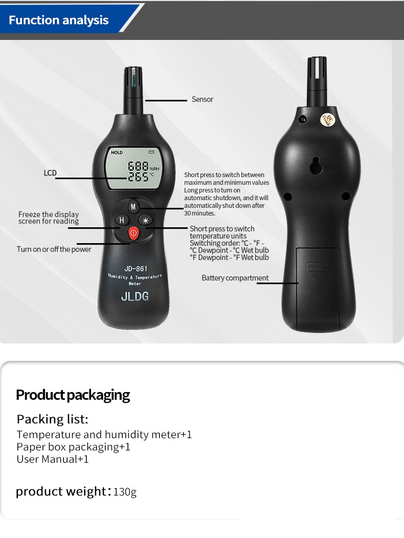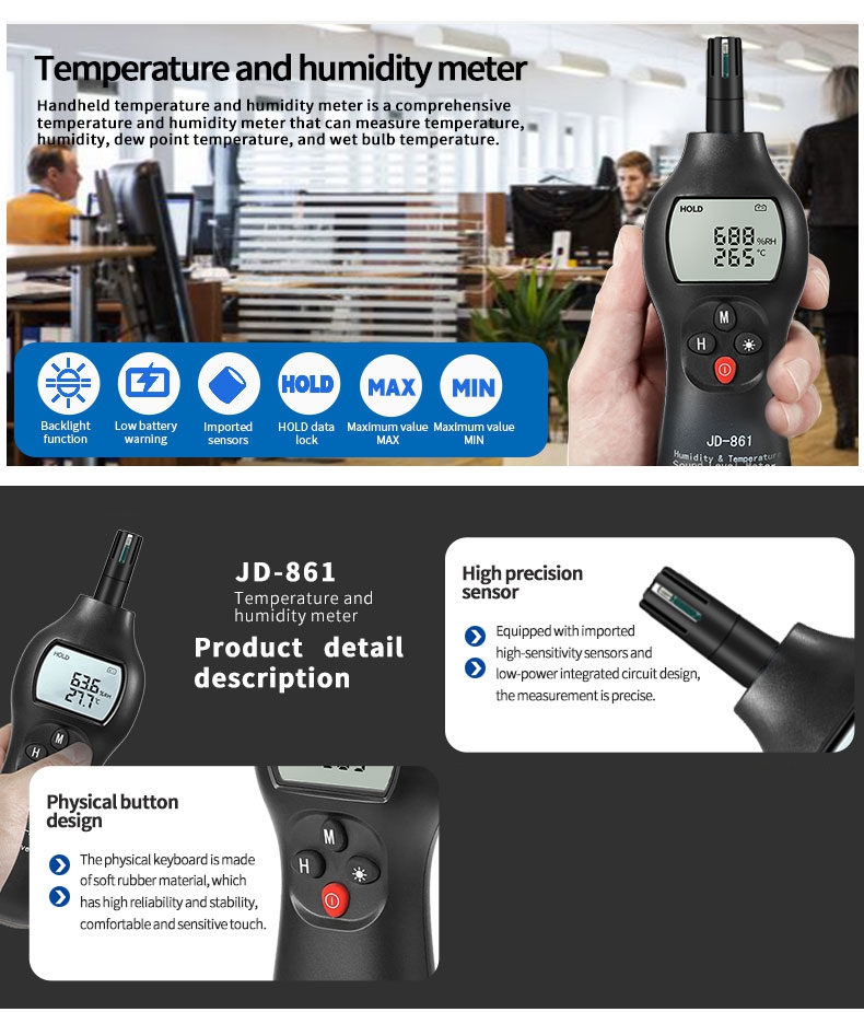 - JD-861 is a battery-powered instrument for measuring relative humidity and temperature. It can display three different ambient temperature, wet bulb temperature and dew point temperature of the air around its sensor.