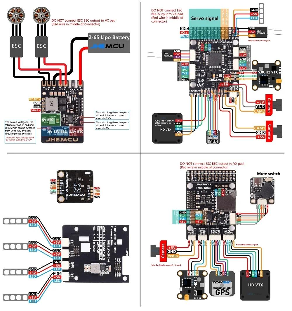 - The main control uses F405 chip, 1MB FLASH, rich interface, full-featured. Built-in TF card holder, barometer, gyroscope, OSD, reserved interface socket, can be inserted or welded. With high current PDB board, built-in ammeter detection. Default 5V BEC servo output 8A, can also be set to 6V/6.5A and 7.4V/6A servo power supply through the jumper pads of the PDB. 5V BEC is also integrated on the PDB to power the flight controller and 9V BEC to power the mapping (can be switched to 12V). There is an additional 3.3V LDO reserved. There is a separate 5V BEC on the LED board that can be connected to four WS2812 strips, and the control signal is provided by the LED Strip on the F405. The extended USB interface board has a BOOT button, and a 110 dBm buzzer with a switch to turn it off.