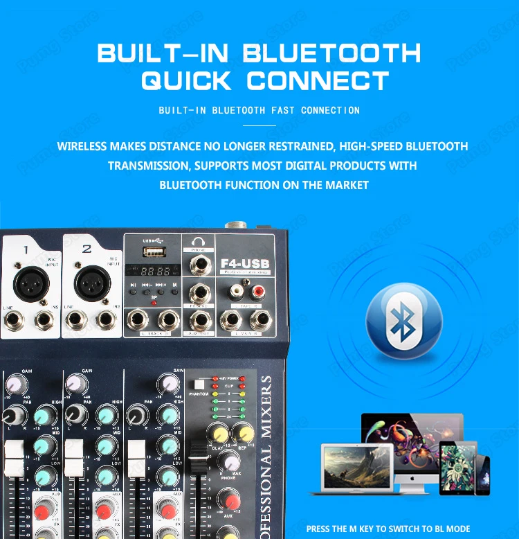 - U Disk Directly Live -- U disk input can directly make plug-in live, supporting mobile storage device U disk, it can store songs in U disk, inserted for playback