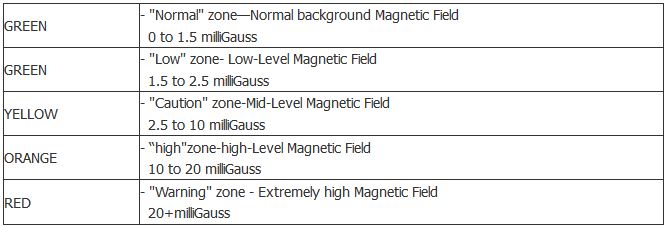 The EMF METER measures magnetic field strength. GREEN LED's indicates normal everyday levels of exposure, the higher more suspect field strength readings are indicated by the YELLOW, ORANGE and RED LED displays
