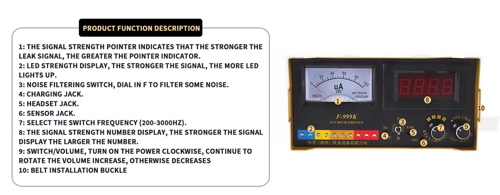 - It is an instrument used to detect the presence of leaks in various systems, containers, or pipelines. During long-term use, pipelines may experience water leakage due to aging, corrosion, physical damage, and other reasons. Using a leak detector can detect these problems in a timely manner, avoiding greater losses such as floor deformation, damage to indoor decoration, and even endangering personal safety.