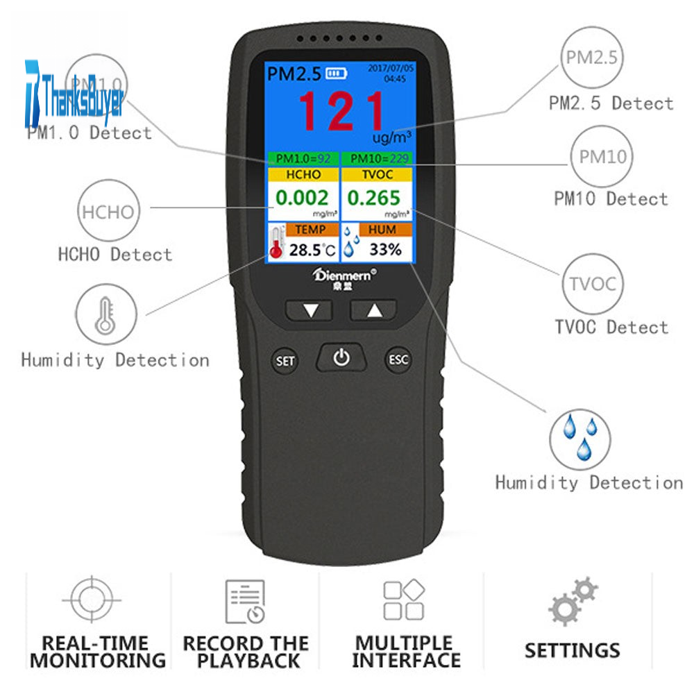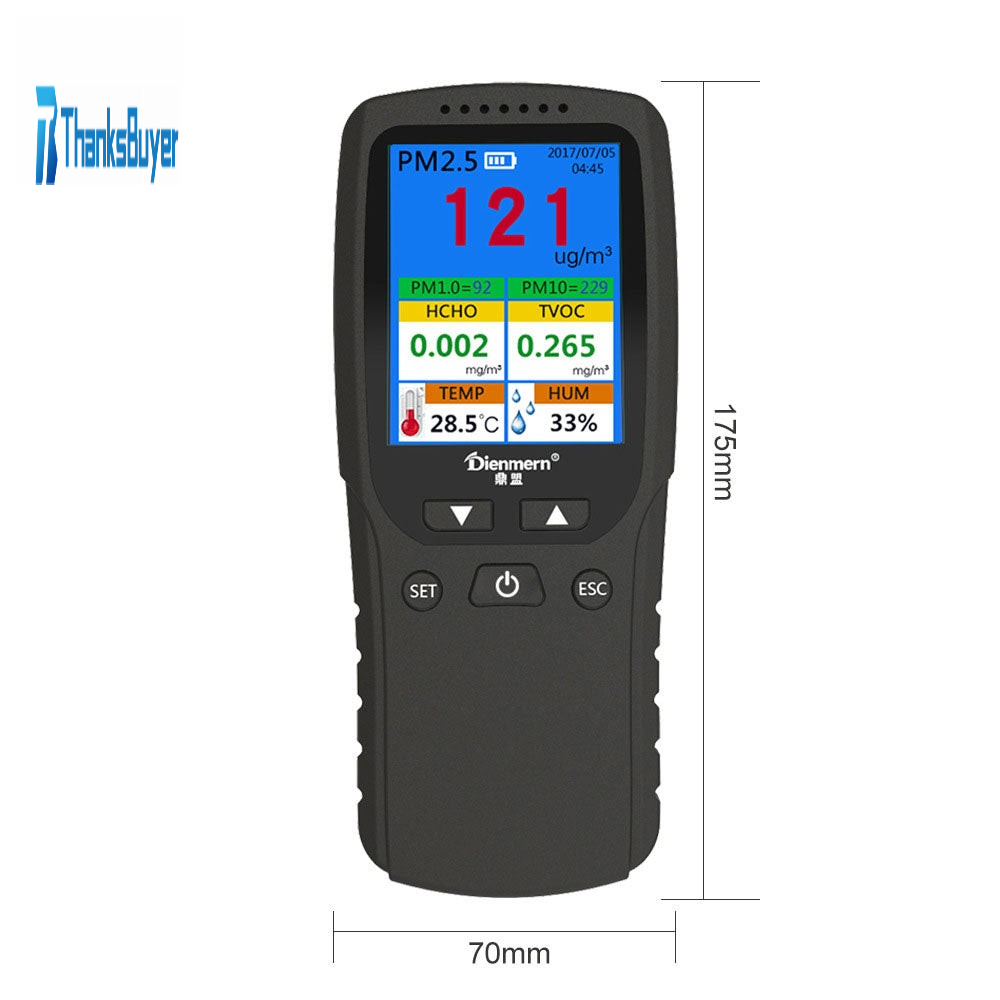 This advanced multifunctional air quality monitor integrates multiple high-quality sensors with a built-in fan for real-time monitoring. It accurately measures PM2.5, PM10, PM1.0, formaldehyde (HCHO), total volatile organic compounds (TVOC), air quality index (AQI), temperature, humidity, and time, all displayed on its digital LCD screen.
