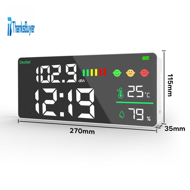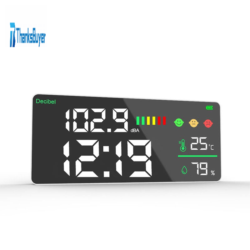 * The noise meter can display decibel values, temperature, humidity, and time.