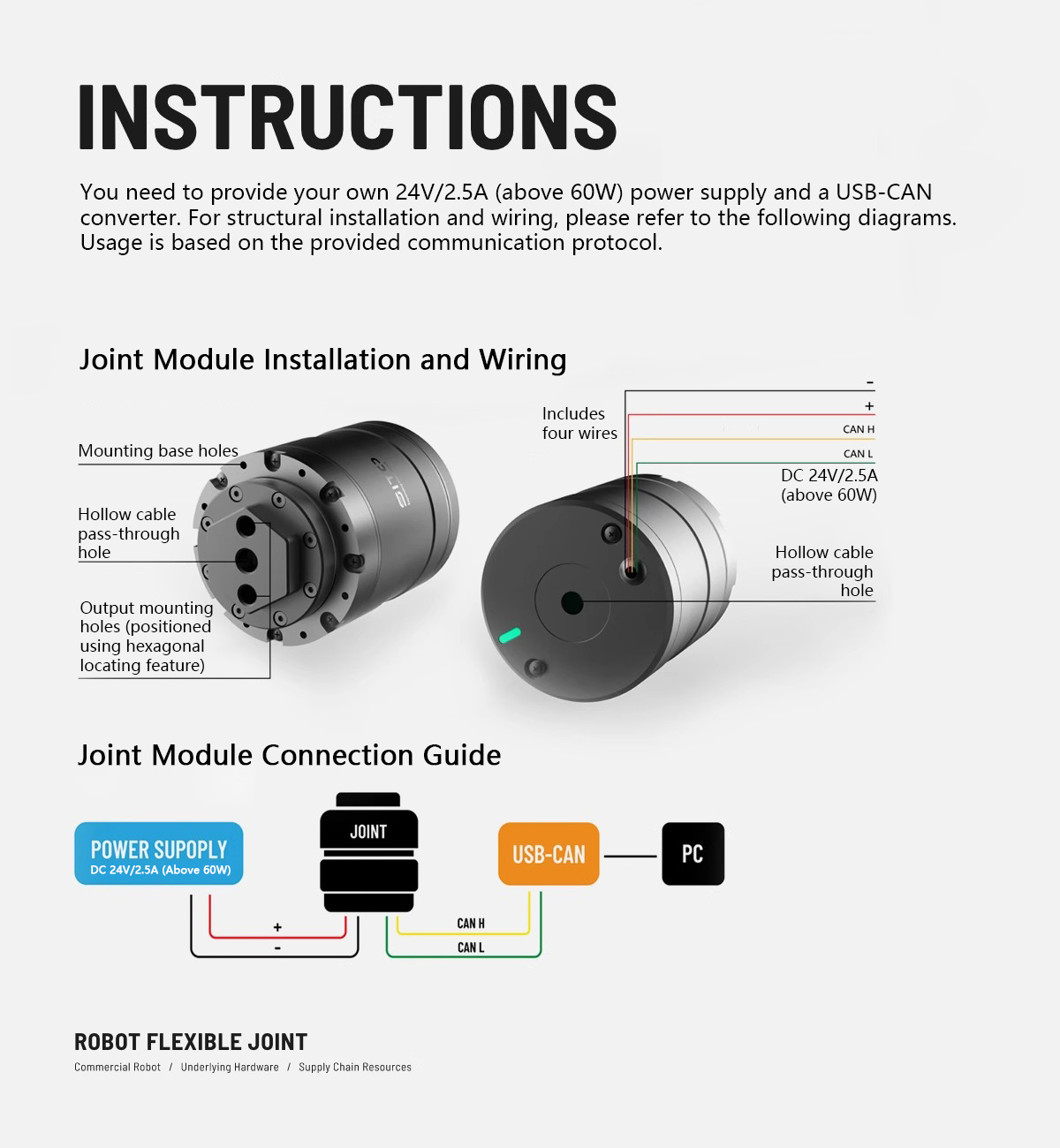 * The joint module adopts a hollow design and consists of a harmonic reducer, brushless DC motor, FOC driver controller, and dual encoders.