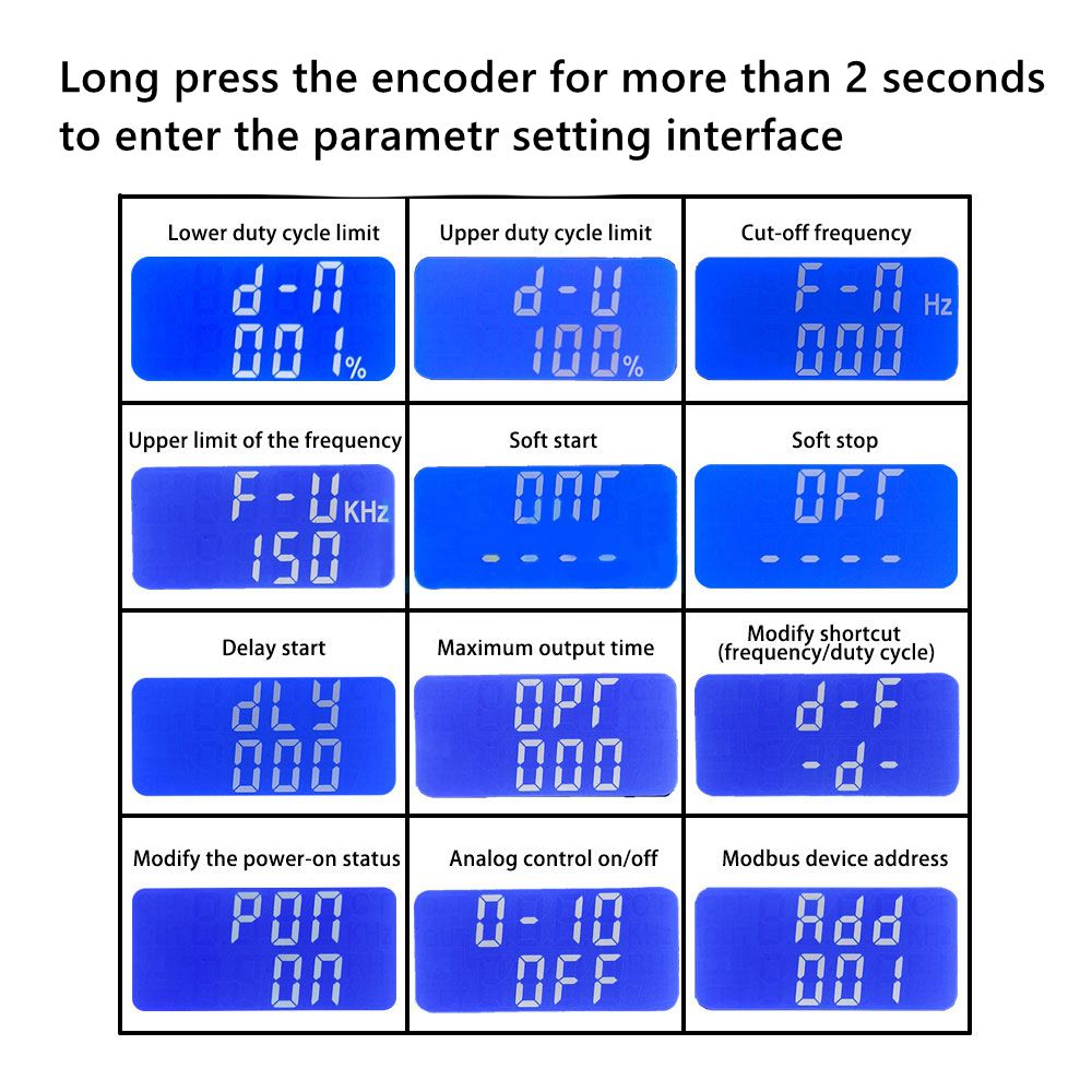 - The upper and lower limits of the working frequency and duty cycle can be set, which is convenient for users to adjust according to their own.