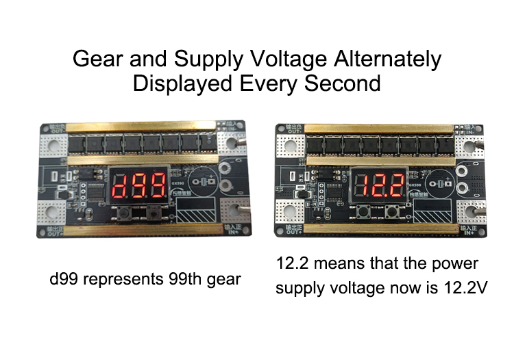 When in standby, the digital tube will alternately display the gear and the power supply voltage every second. When it displays in d+**, it means the current gears is **. For example, d99 means the welding intensity is the 99th gear. When it displays in 12.2, for example, it means the voltage of power supply is 12.2V. And if the voltage is 9V, and 9.00 will be displayed.