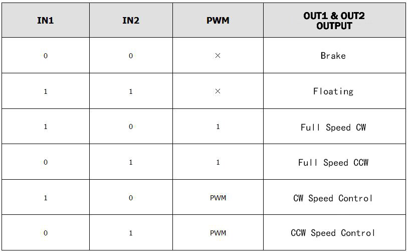 - Similar to L298 drive logic, three wires (PWM, IN1, IN2) can be used to control speed, CW, CCW and brake