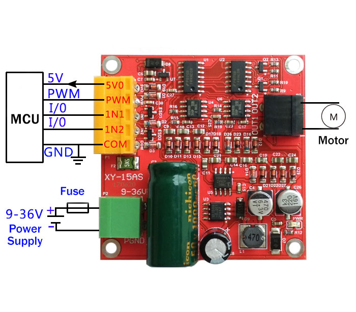 The power supply ground of MCU is connected to the COM of the driver module. PWM pin is connected to the PWM output of MCU for speed regulation or directly connected to high level for full speed operation. IN1 and IN2 are connected to two IOs of MCU to control CW, CCW and braking of motors. 5VO can provide 5V power for MCU.