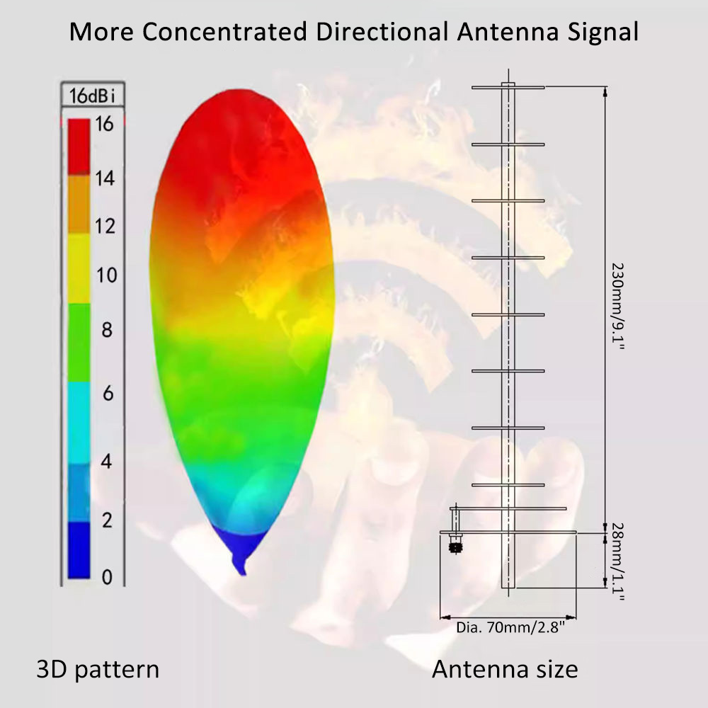 * Because 16dBi is a very high gain, it is capable of receiving or transmitting over longer distances, but the maximum wireless signal rate is the physical rate from the IEEE standard 802.11 specification. Actual wireless data throughput and wireless coverage, as well as the number of connected devices, will depend on network conditions, access point limitations, and environmental factors, including building materials, obstacles, traffic volume and density, and the location of the access point.