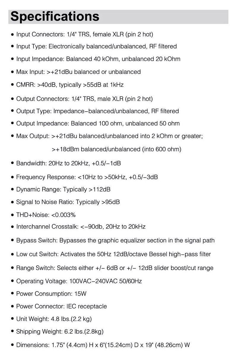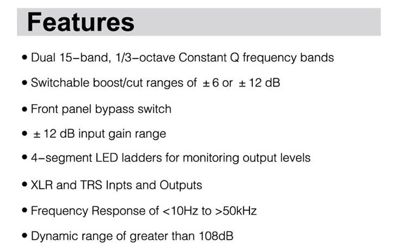 - Dual 15-band, 1/3-octave constant Q frequency bands