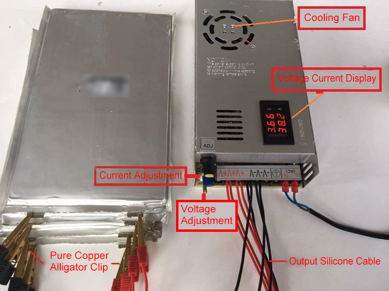 - Full self stop, the indicator light on the power supply is the power indicator and does not change color. The power supply usually heats up during charging. The power supply does not heat up when fully charged. Of course, you can also use a digital meter to measure the voltage of the battery cell. If the lithium iron battery is 3.65V or the ternary polymer battery is 4.2V, it is fully charged (Warning! The adjustable power supply means adjusting the no-load voltage to a certain level and charge it to the highest level, and the lithium iron phosphate battery can be adjusted to 3.65V or the ternary polymer lithium battery can be adjusted to 4.2V. Do not adjust it too high.). After being fully charged, the power will not be cut off, and the battery cell voltage will only be maintained. It won't overcharge. (No load refers to the charger being plugged into 220V and the output not connected to the battery)