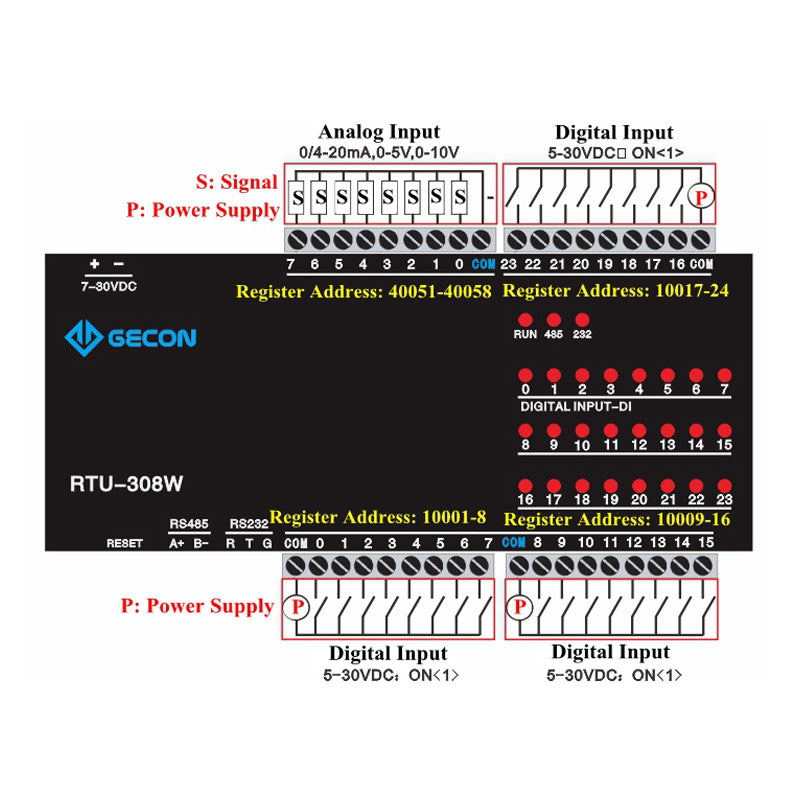 24DI 8AI Data Acquisition For Modbus RTU IO Module PLC Extension RTU-308W 8AI + 24DI [RS485+RS232]