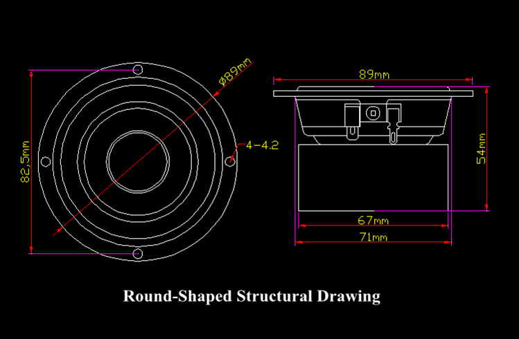 - Round Speaker: Outer diameter 89MM/3.5". Diagonal screw distance 82.5MM;