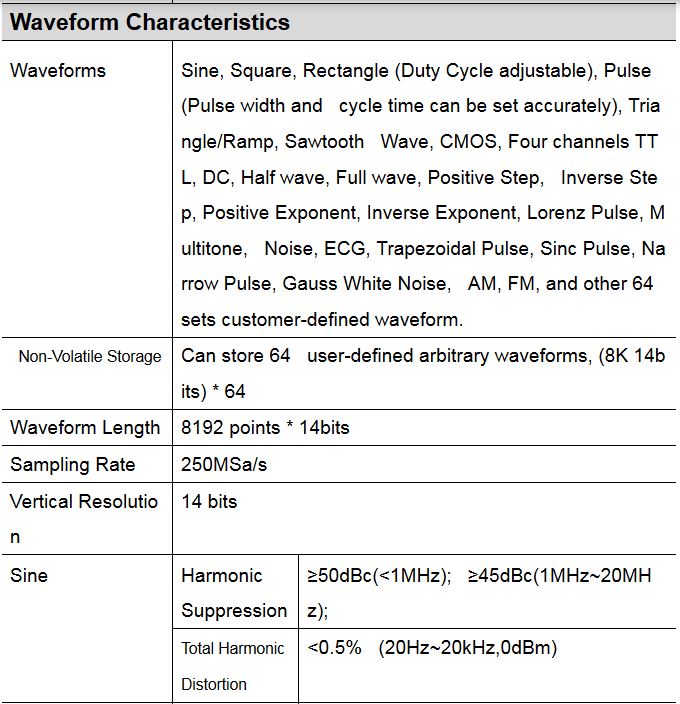 ◆ The highest output frequency is 60MHz (sine wave), 250MSa / s sampling rate, 14bits vertical resolution.