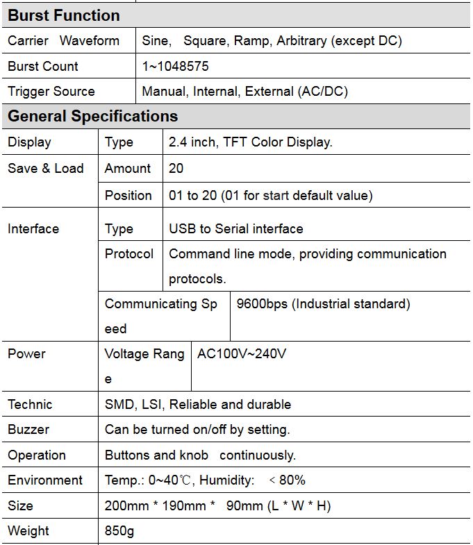 ◆ Pulse Train Bursted Output Function: Optional three trigger modes: Manual trigger, internal CH2 trigger and external trigger, which can make the machine output any pulse train of 1 ~ 1048575.