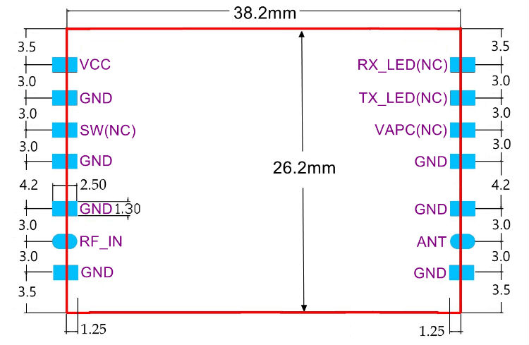 - Maximum transmit power: 31.5dBm (1.4w) at 3.7V power supply voltage; 33.5dBm (2.3w) at 5.0V power supply voltage; 34.5dBm (2.8w) at 6.0V power supply voltage