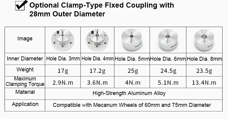 * If your motor shaft doesn't have a key-way, we strongly recommend using a clamp-style coupling. Traditional couplings are fixed with a set screw, and after prolonged use, the wheels can become loose. The clamp-style coupling, used in industrial applications, provides long-term stability and ensures that you won't have to worry about the wheels falling off.