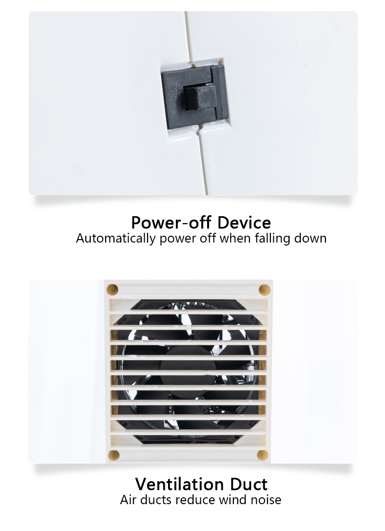 - PTC quick heating; uniform heat; One-button to turn on/off; compact and portable